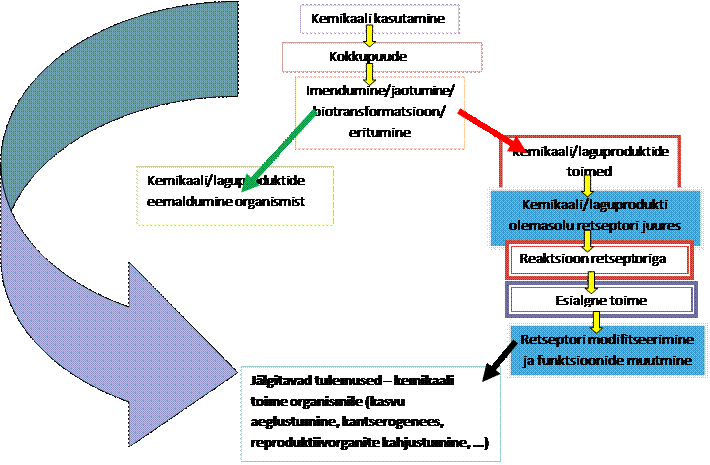 Toodud skeemilt näeme, et kemikaalide kasutamine loob võimaluse nende kokkupuuteks elustikuga. Kuidas ja millal see aset leiab, sõltub väga paljudest asjaoludest.